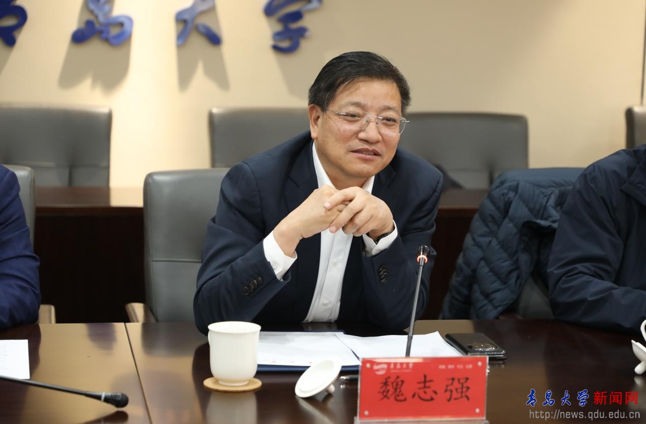魏志强代表青岛大学对郝曙光一行的到来表示热烈欢迎,并重点介绍了学校在优势特色学科建设、科研平台搭建、产教融合机制完善方面的实践经验。他表示,青岛大学聚焦国家战略和区域经济社会发展需求,突出“医工交叉、特色鲜明,文理支撑、综合厚重”,深入推进“医学+”“纺织+”“系统+”等七大学科集群建设,围绕大需求、大企业、大项目、大平台、大团队、大成果,推动科研创新和成果转化,构建“环青大科创园”,持续服务地方经济社会发展。他希望两校以此次交流为契机,在学科建设、人才培养和产学研融合等领域进一步深化交流协作,携手为山东省高等教育事业发展贡献力量。