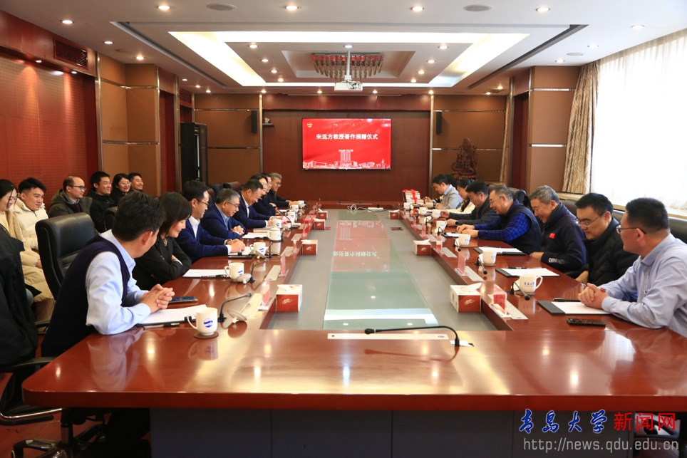 新闻网讯 1月24日下午,宋远方博士著作捐赠仪式在浮山校区办公楼201会议室举行。校党委书记胡金焱出席仪式并致辞。山东省人大常委会原副主任、青岛市人大常委会原主任、省老年人体育协会主席、博士宋远方,校职业经理人学院院长、青岛市国资委原党委书记、主任、一级巡视员马卫刚,青岛市人大常委会原副秘书长、办公厅主任隋志强,青岛市人大常委会代表工作委员会代表建议处处长王大鹏应邀莅临。仪式由校党委常委、副校长刘恩贤主持。