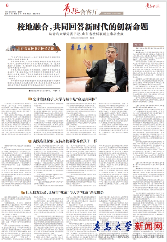 新闻网讯 2月28日,《青岛日报》刊登我校党委书记胡金焱专访文章《校地融合,共同回答新时代的创新命题》,就如何将青岛的高等教育资源优势转化为城市的发展优势、如何形成高校与城市良性互动的成熟生态等问题,胡金焱进行了深入阐述。