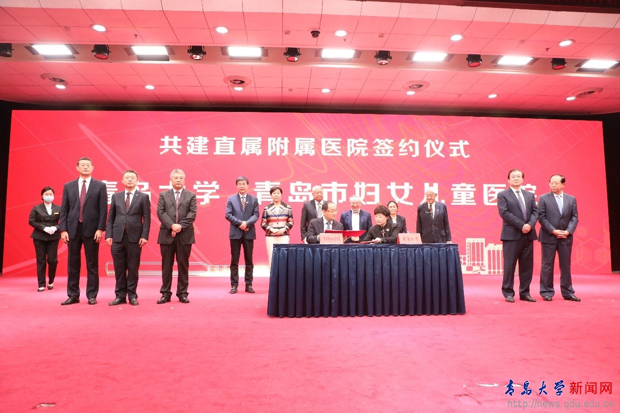 仪式上,在原青岛大学医学院老领导陈在春、郭玮、唐明、谢俊霞、老教授代表丁世海以及现任青岛大学医学部党工委书记王新生共同见证下,青岛大学医学部部长姜宏分别与青岛市市立医院院长管军、青岛市中医医院(青岛市海慈医院)院长池一凡、青岛市中心医院院长兰克涛、青岛市第三人民医院院长邢晓博、青岛市妇女儿童医院院长邢泉生、青岛市口腔医院院长王万春、青岛开泰耳鼻喉头颈外科医院院长徐欣签署共建直属附属医院协议,并共同为7家新增直属附属医院揭牌。