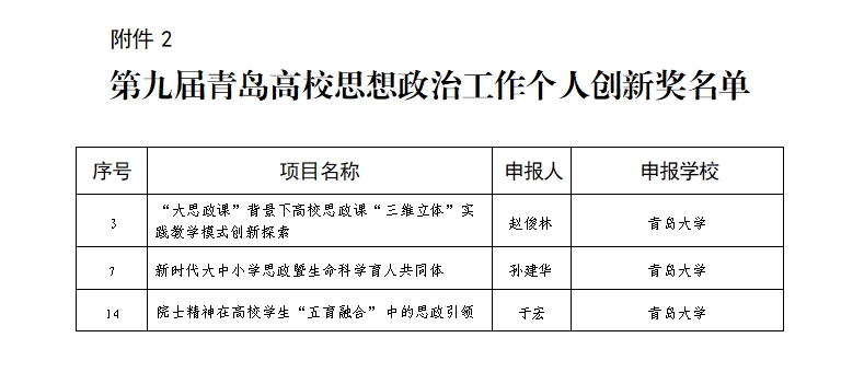 马克思主义学院赵俊林申报的《“大思政课”背景下高校思政课“三维立体”实践教学模式创新探索》、生命科学学院孙建华申报的《新时代大中小学思政暨生命科学育人共同体》、自动化学院于宏申报的《院士精神在高校学生“五育融合”中的思政引领作用机制与评价体系实践》获评青岛高校思想政治工作个人创新奖。