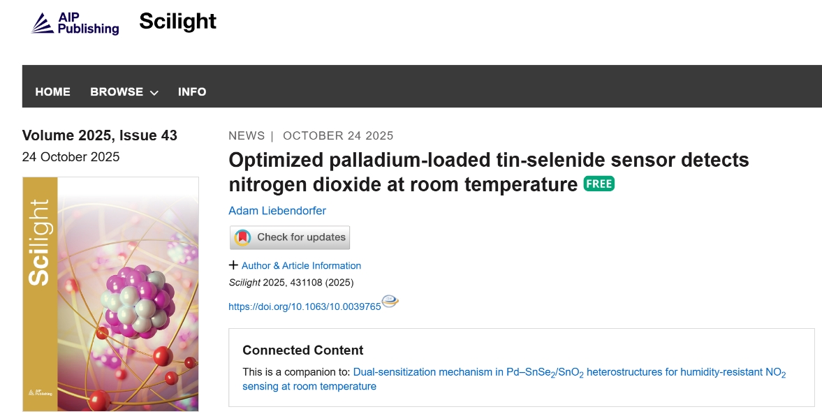 新闻网讯 近期,物理科学学院张军教授团队发表题为“Dual-sensitization mechanism in Pd-SnSe2/SnO2heterostructures for humidity-resistant NO2sensing at room temperature”的研究论文。该研究成果受到美国物理学联合会“科学之光”(Scilight)专题采访报道。