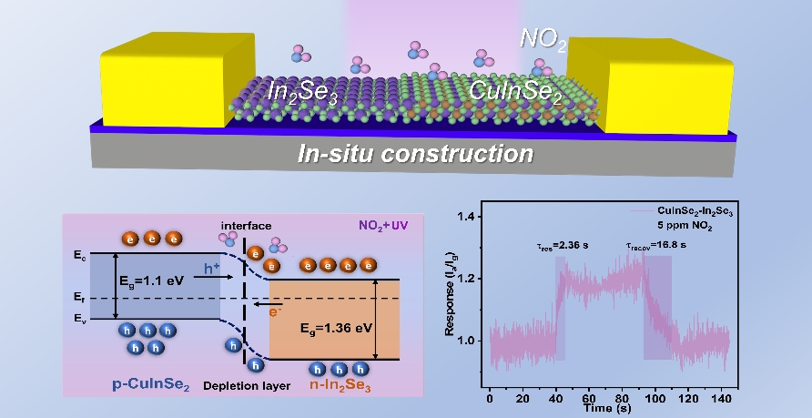 针对传统过渡金属硫族化合物(TMD)异质结制备中存在的转移损伤与界面退化问题,团队创新提出“直接原位固相转化”策略,一步构筑片上集成式二维CuInSe₂–In₂Se₃异质结,避免了机械转移过程,显著提升了器件的一致性。该异质结在365 nm紫外光激发下具备自驱动运行能力,在室温下对5 ppm NO₂表现出高选择性与超快响应(2.36秒),灵敏度达到国际先进水平,为面向物联网的低功耗、高性能气体传感器提供了新路径。该研究成果以“In situ construction of CuInSe2–In2Se3heterojunctions for highly selective self-powered NO2sensors”为题,发表在物理学领域的自然指数期刊Appl. Phy. Lett.,并被遴选为“Editor's Pick”。2023级硕士研究生姜浩为第一作者,郑威副教授与张军教授为共同通讯作者。