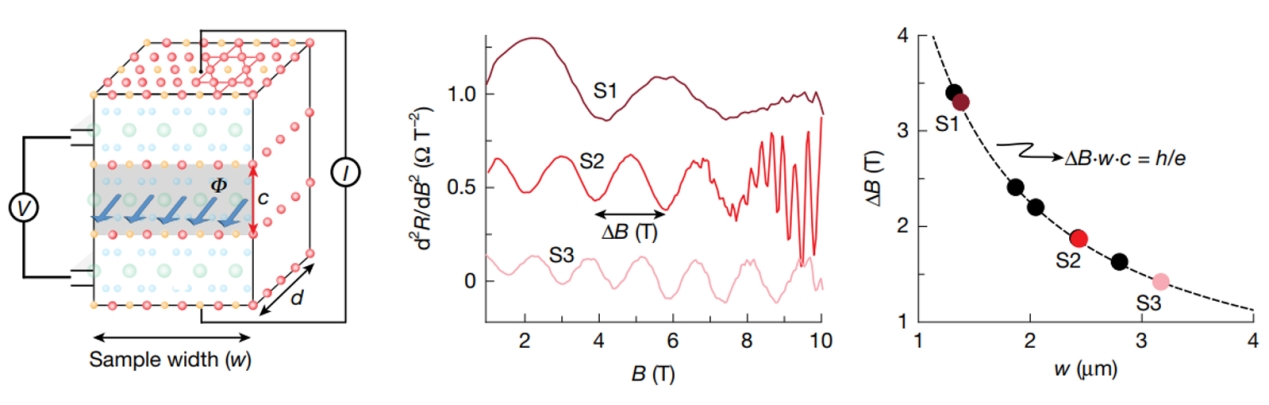 本工作在CsV3Sb5的层间电输运信号中发现了30 K以下正比于磁场且周期为h/e的磁电阻振荡。其对磁场的角度依赖关系以及较短的平均自由程均与同样表现出h/e振荡的高电导率金属PdCoO2不同,表明单粒子图像难以解释这一现象。这些发现指向了一种宏观相干的集体电子态,其相干特性类似于超导电性,但缺乏无耗散凝聚。本工作确立了笼目金属体系作为实现和探索相干电子态的优越平台,展示了利用几何结构、磁阻挫或电子相互作用实现量子相干性的全新途径,为实现新型高温量子干涉器件开辟了新的方向。