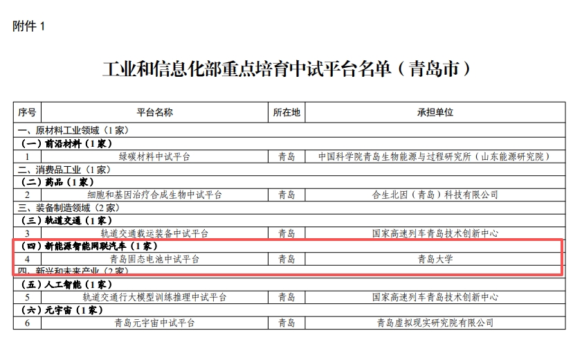 新闻网讯 近日,面向产业技术基础公共服务,国家工业和信息化部公布了新一批重点培育中试平台名单,青岛大学郭向欣教授领衔的“固态电池山东省工程研究中心”成功入选。这是我校在新能源材料与器件领域平台建设中获得的重要国家级认可,标志着学校服务国家战略需求和推动关键技术创新转化方面取得新突破。