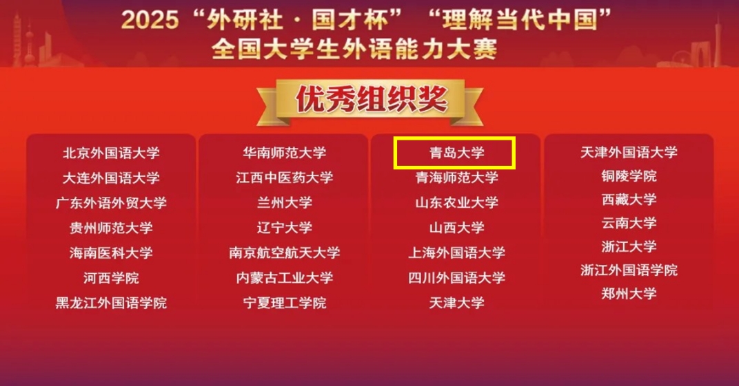 新闻网讯 近日,2025“外研社·国才杯”“理解当代中国”全国大学生外语能力大赛全国决赛在北京外国语大学落下帷幕。我校校赛组织工作由公共外语教育学院联合外语学院、国际教育学院共同开展。自3月启动以来,全校近千名学生踊跃参与,在指导教师的精心辅导和参赛学生的共同努力下,荣获多项国家级奖励。因校赛组织工作成效显著、国赛成绩突出,我校同时荣获“优秀组织奖”。