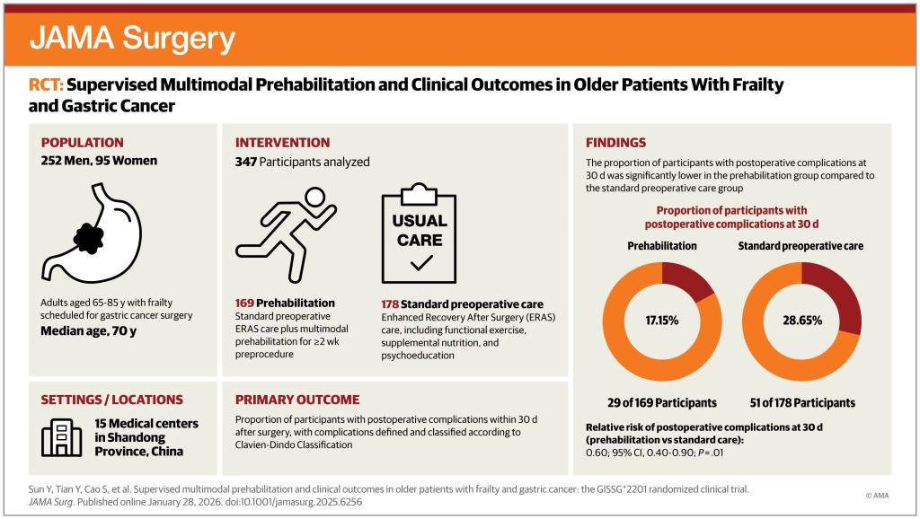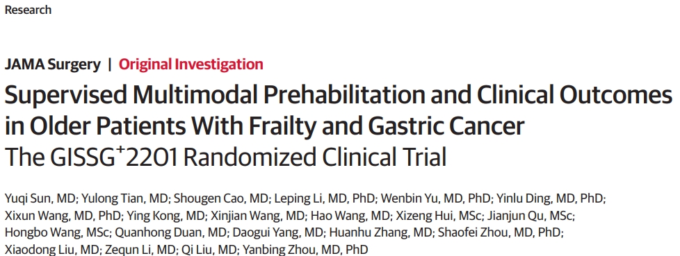 新闻网讯 近日,青大附院胃肠外科周岩冰教授作为主要研究者(Leading PI),牵头开展的研究者发起(IIT)多中心随机对照试验(RCT)研究成果,正式发表于外科学领域国际顶级期刊《美国医学会杂志·外科学》(JAMA Surgery)。该研究论著标题为“Supervised Multimodal Prehabilitation and Clinical Outcomes in Older Patients With Frailty and Gastric Cancer: The GISSG+2201 Randomized Clinical Trial”(《居家监督下多模式预康复对虚弱老年胃癌患者临床结局的影响:GISSG+2201随机临床试验》)。我校2025届博士毕业生、急诊外科孙钰淇医师为第一作者,作为博士课题全程参加此项研究。周岩冰教授为唯一通讯作者。此项高水平研究成果的发表标志着青大附院在老年胃癌患者围手术期管理领域的研究达到国际领先水平,取得了具有里程碑意义的重要进展。