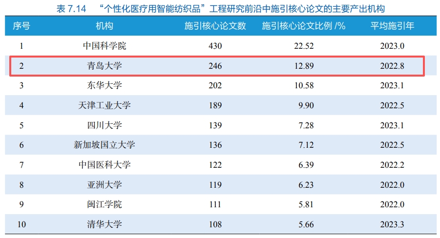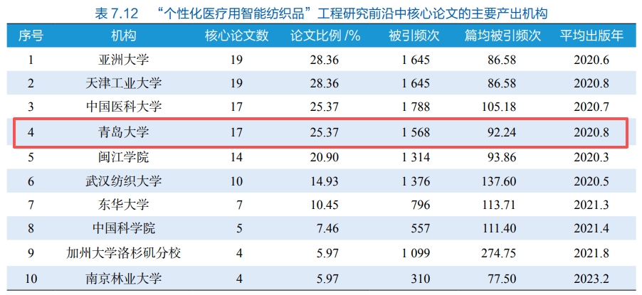 新闻网讯 近日,中国工程院发布《2025全球工程前沿》报告,青岛大学成功入选“个性化医疗用智能纺织品”工程研究前沿中施引核心论文的主要产出机构榜单,位列全球第2;成功入选核心论文的主要产出机构榜单,位列全球第4。