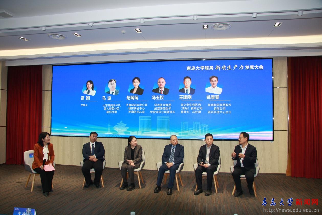 企业分享环节中,青岛国信制药有限公司研发部副总监杜昌余、江苏恒瑞医药集团战略发展部副总经理陈洪华分别进行企业推介。在产学研融合对话环节,山东威高手术机器人有限公司副总经理马波、齐鲁制药有限公司临床研发中心肿瘤医学总监赵萌萌、诺森医学集团/成都诺森医学检验有限公司董事长冯玉权、康立泰生物医药(青岛)有限公司董事长兼总经理王建刚、鲁南制药集团股份有限公司新药药理中心主任姚景春等五位嘉宾,围绕共建“医—工—研”交叉创新机制、临床需求牵引科研攻关与产品开发等议题展开深入研讨,表达了通过校企合作机制与青岛大学建立更紧密合作关系的积极意愿。