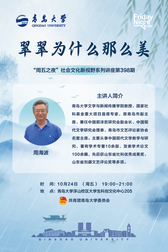 主讲人简介:青岛大学文学与新闻传播学院教授、国家社科基金重大项目首席专家,原青岛市文学艺术届联合会副主席、兼任中国郭沫若研究会副会长、中国现代文学研究会理事、青岛市文艺评论家协会名誉主席。主要从事中国现代文学教学与研究,著有学术专著10余部,发表学术论文100余篇,先后获山东省社科优秀成果奖、山东省刘勰文艺评论奖等多项。