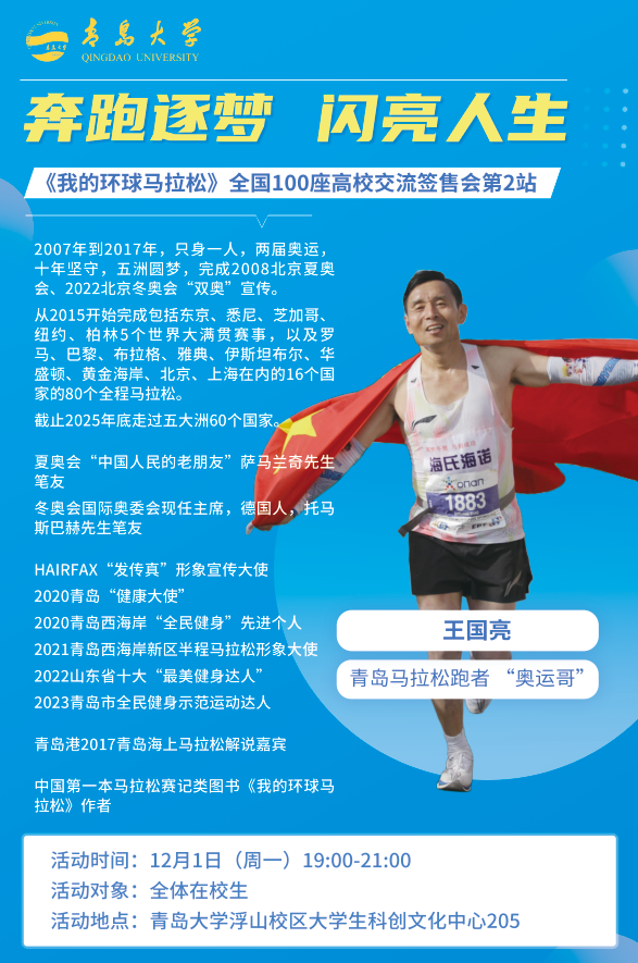 他就是“奥运哥”王国亮,一个将个人梦想与国家荣誉紧密相连的奔跑者。本期青年大讲堂由青岛大学团委联同合作发展处,邀请王国亮先生讲述马拉松背后的故事。他用自己的方式诠释着“为国争光”的深刻内涵——不需要惊天动地的壮举,只需在平凡的坚持中创造不凡。