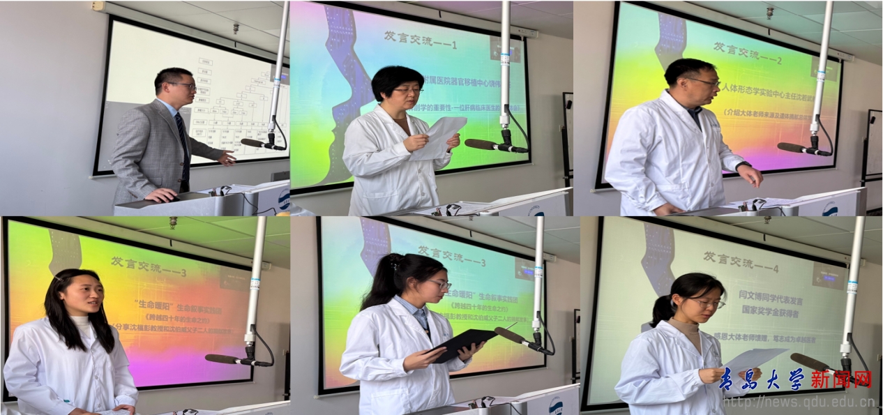 “生命暖阳”生命叙事实践团盛鹏圆和张泽彧同学讲述了一个“跨越四十年的生命之约”的故事。她们分享了沈福彭教授和沈伯威父子二人的感人事迹。沈福彭教授是中国首位自愿捐献遗体制成骨架标本的医学教育家。2025年,沈伯威在生命末期选择将遗体捐献给青岛大学青岛医学院,延续医学研究。父子二人以不同方式践行“医学为民”精神,成为跨越时代的生命接力典范。