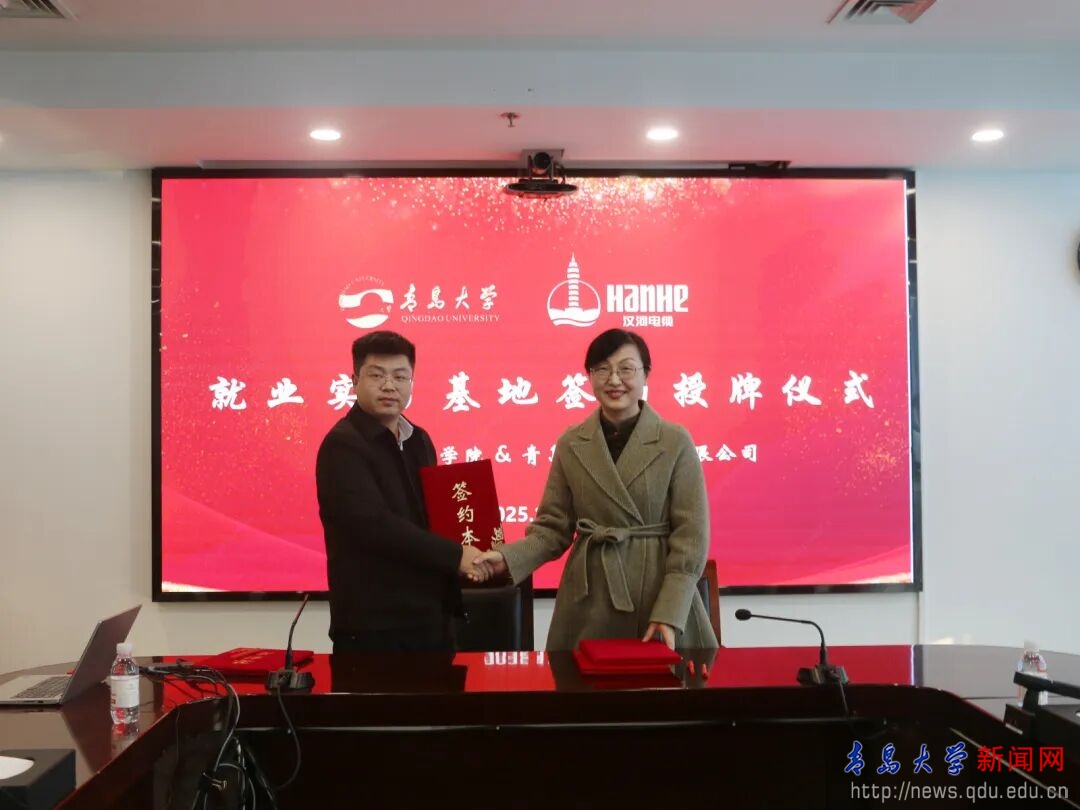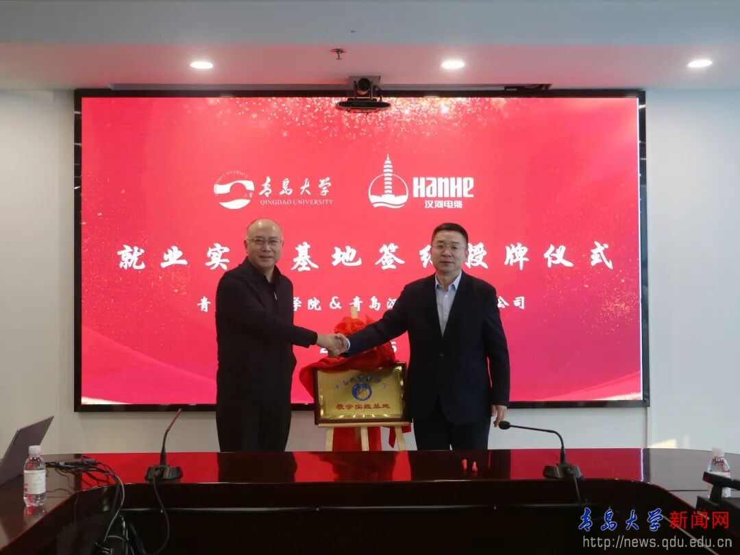 王庆金与张立刚共同为“青岛大学商学院教学实践基地”揭牌。尼梅颉与汉缆股份副总经理张兵共同签署了《合作建设本科教学实习基地协议书》。