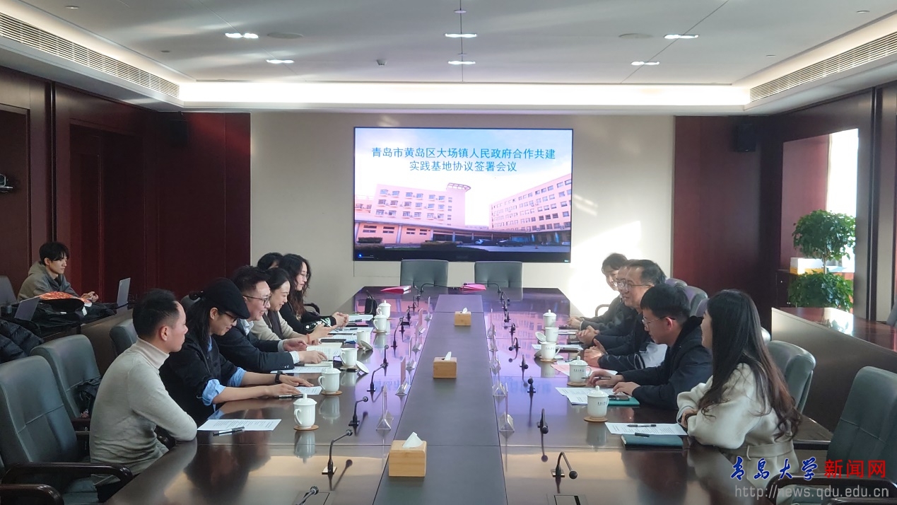 新闻网讯 1月15日下午,艺术学院与黄岛区大场镇人民政府合作共建实践基地签约仪式在学校会议中心举行。双方围绕校地协同发展、实践育人机制建设以及乡村振兴创新路径展开深入交流,并正式签署合作协议。大场镇人大主席蔡智峰,大场镇党委副书记、政法委员张建宁,艺术学院党委书记魏喆吉、副院长黄钺出席签约仪式。