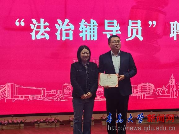 学工办主任李珂代表纺织服装学院向刘世吉律师颁发“法治辅导员”聘书。她说,开展法治教育是落实立德树人根本任务的关键举措,勉励学生积极学习法律知识、提升法治素养,争做遵纪守法、成为担当有为的时代新人。