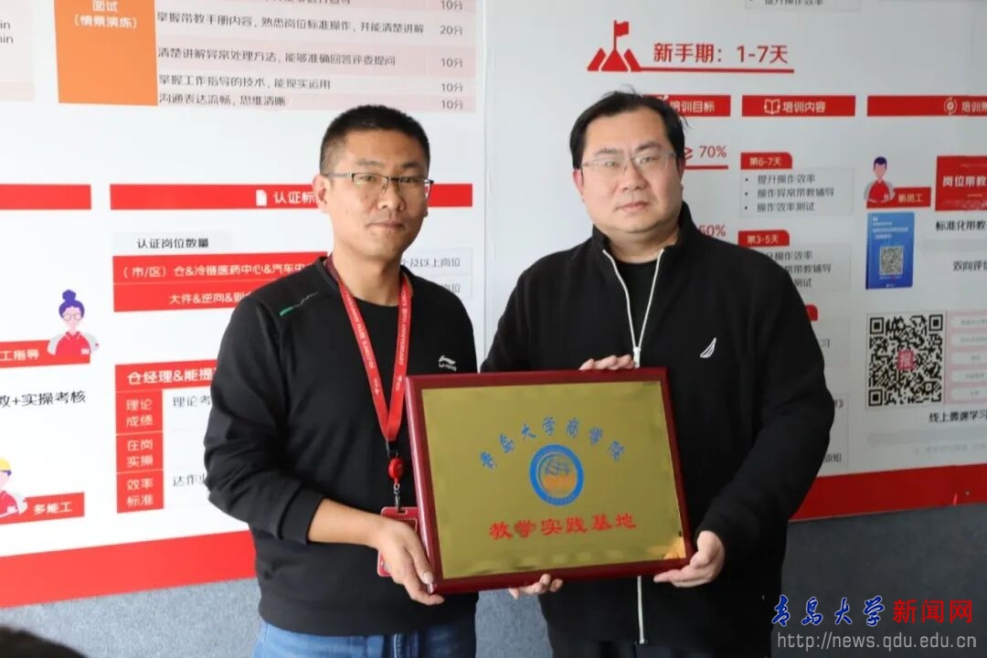 马骋和贾国栋代表双方签署了校企合作协议,并举行了“青岛大学商学院就业实习基地”授牌仪式。