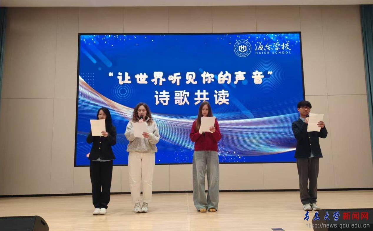 活动现场,我校国际学生与海尔学校学生并肩诵读,以声传情。围绕《致橡树》《将进酒》《你是人间四月天》等经典诗作,中外学子在抑扬顿挫的吟诵中感受中华诗词的凝练之美与情感张力,搭建起心灵相通的桥梁。活动充分展现了中外青年对经典文化的热爱与传承,也体现了“和羹之美,在于合异”的跨文化交流理念,现场气氛温馨热烈,赢得双方师生一致好评。