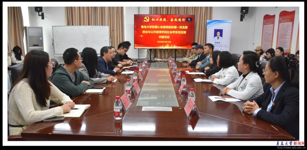 新闻网讯 4月16日下午,政治与公共管理学院社会学系党支部与青岛大学附属心血管病医院第一党支部在金家岭校区二号实验楼214会议室举行支部共建活动。学院党委书记尹文博、社会学系党支部书记石腾飞、院长助理李海荣,附属心血管病医院纪委书记韩淑春、第一党支部书记郭琳琳及双方师生代表40余人参加。活动由学院党委副书记徐伟主持。