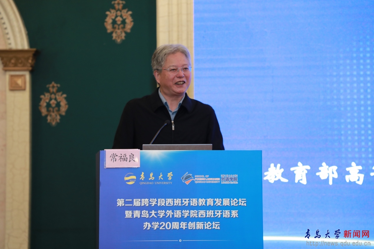 随后,教育部高等学校外语专业教学指导委员会西班牙语分委会主任委员、北京外国语大学常福良教授发表致辞。他回顾了我国西班牙语专业的建设历程和已取得的人才培养成果之后,常福良表示,在人工智能时代,西班牙语教育应主动适应技术变革,更新教育理念和模式,建设配套教材,通过培养复合型人才,构建中外理性认知,助力中西与中拉人文交流。