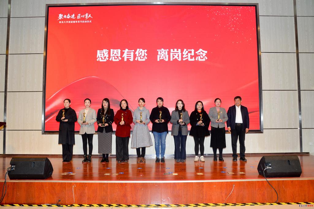 在仪式上,隆重表彰了过去一年在各项学生工作中涌现的先进典型。承载着实践智慧与育人温度的《青岛大学辅导员优秀工作案例集》正式发布。“力行班”班主任、青岛医学院辅导员宋莉老师将案例集赠予“力行班”辅导员代表,完成了温暖的交接与传承。在“薪火相传,师生故事”环节,四位年轻辅导员深情讲述了他们从“青大学子”到“青大辅导员”的蜕变历程,分享了自己的辅导员昔日给予的关怀如何在他们心中播下育人的种子。在“感恩有您,离岗纪念”环节,校领导为2024年离开学生工作岗位并为学工事业奉献10年以上青春的“老兵”们颁发离岗纪念奖杯,感谢他们十余年的深耕细作,为学校育人事业打下了坚实的基础。最后,仪式在《明天会更好》歌声和所有辅导员的笑脸中圆满结束。