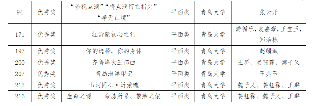 此次获奖作品均来自艺术学院学生,这些作品主题鲜明、形式多样,涵盖红色文化、海洋保护、生命关怀、地方精神等多个维度,是艺术学院实践教学与课程思政相结合的成果体现,也展现了青大学子关注社会、贴近时代、勇于创新的良好风貌。