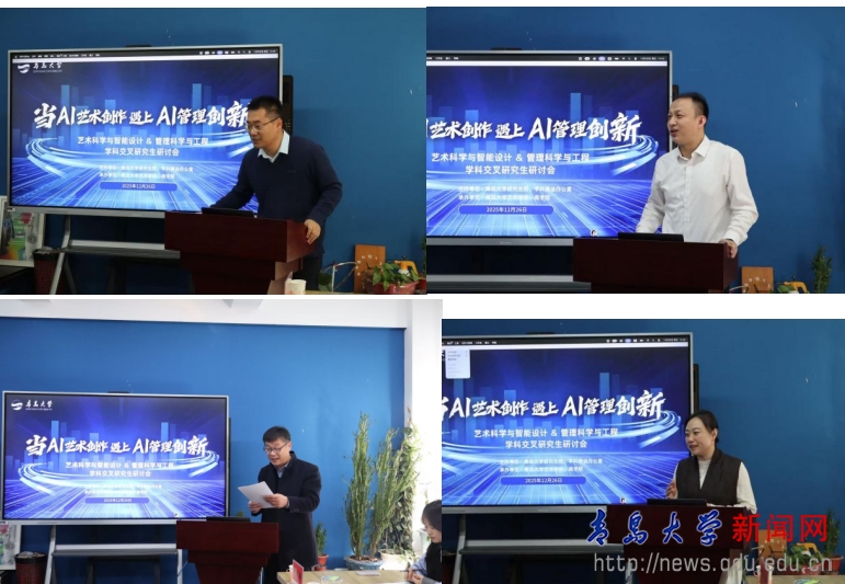 新闻网讯 12月26日下午,由研究生院、学科建设办公室牵头,艺术学院与商学院联合主办的“艺术科学与智能设计&管理科学与工程”学科交叉研究生研讨会于德雅楼409工作室召开。本次会议以“当 AI 艺术创作遇上 AI 管理创新”为核心主题,紧扣学科交叉融合发展趋势,搭建跨学院、跨领域的深度交流平台,旨在推动AI技术与艺术创作、管理实践的深度融合与创新应用。研究生院副院长张宁,学科建设办公室副主任叶超,艺术学院副院长黄钺,青岛家具一号仓创始人于江涛、岛城礼物创始人兼方寸文旅 CEO张文才等企业嘉宾,以及研究生院综合办泮君玲、重点建设科王宁,艺术学院黎晟、魏冉冉,商学院李昱卓等师生代表齐聚一堂,共话跨界创新人才培养新路径。会议由艺术学院陆平教授主持。