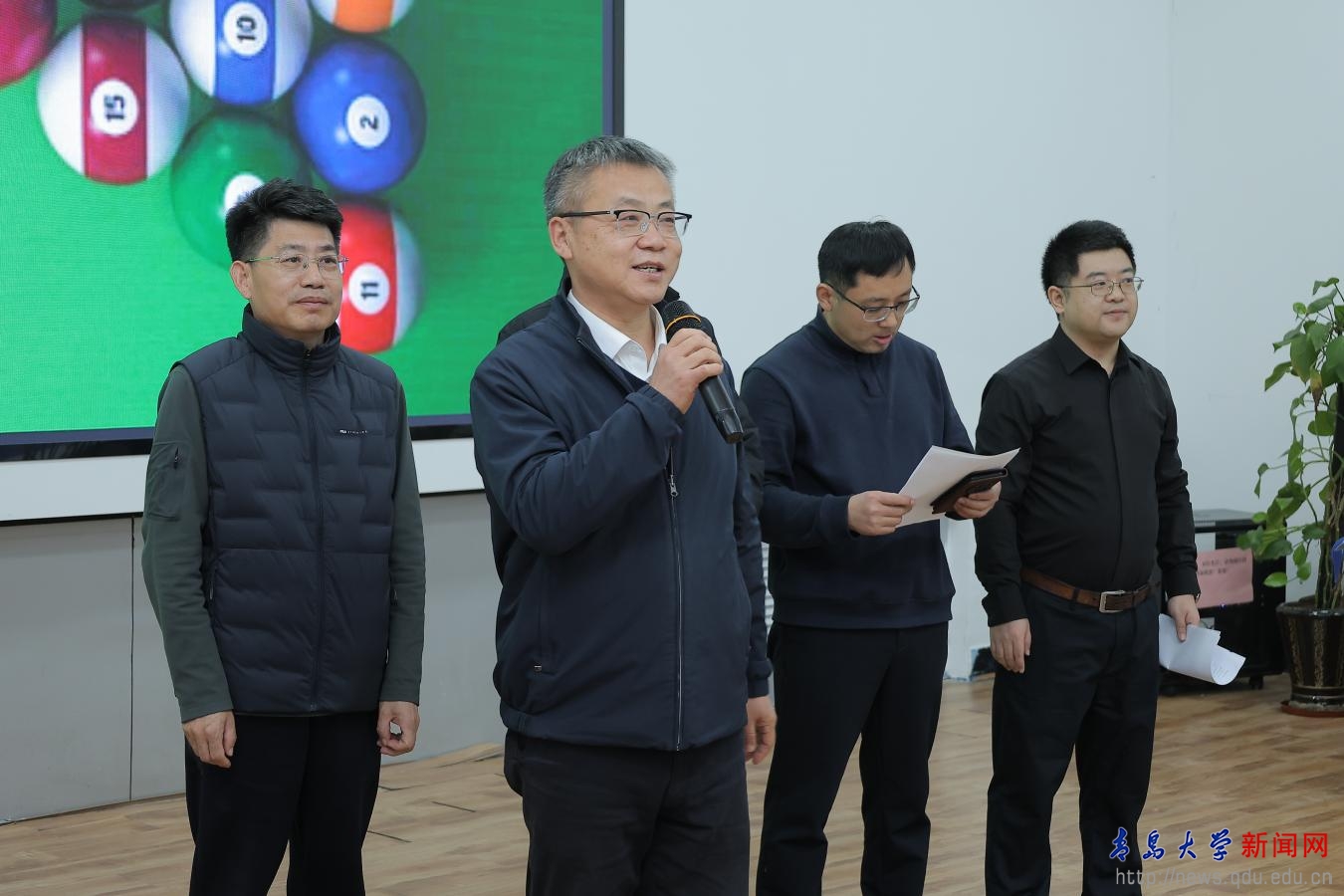 12月18日中午,比赛开幕式在浮山校区教工之家隆重举行。校党委副书记肖江南出席开幕式并为比赛开球。他强调,学校始终重视教职工身心健康发展与校园文化建设,举办台球比赛,不仅为广大爱好者搭建了展示风采、切磋技艺的平台,也进一步增强了学校的凝聚力和向心力。他勉励全体运动员在比赛中赛出风格、赛出水平,并将比赛中展现的专注与从容融入日常工作,以更加饱满的状态投身学校高质量发展。