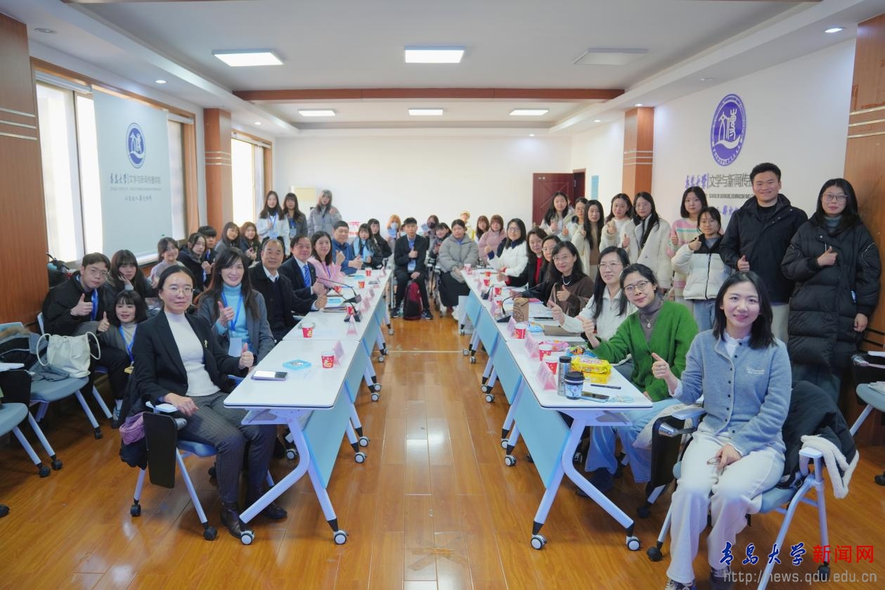 张文彦介绍了文学与新闻传播学院的学科设置、师资力量、科研成果及人才培养特色。与会师生共同观看了青岛大学宣传片,互赠了纪念品,并进行了才艺表演,围绕学术研究、专业学习、校园生活、文化传承等话题进行了深入交流。