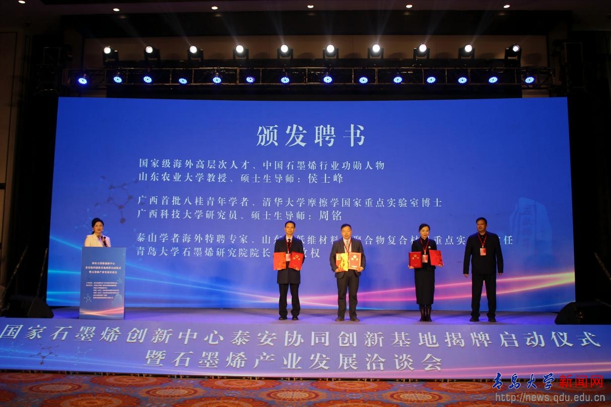 陈涛受邀作为启动嘉宾出席国家石墨烯创新中心泰安协同创新基地启动仪式。合作发展处处长王海荣与泰安高新区委领导韩炳奎共同签署校地合作协议;石墨烯研究院院长刘敬权作为石墨烯领域专家接受聘书与泰山人才金卡,并围绕石墨烯产业发展作主题报告。
