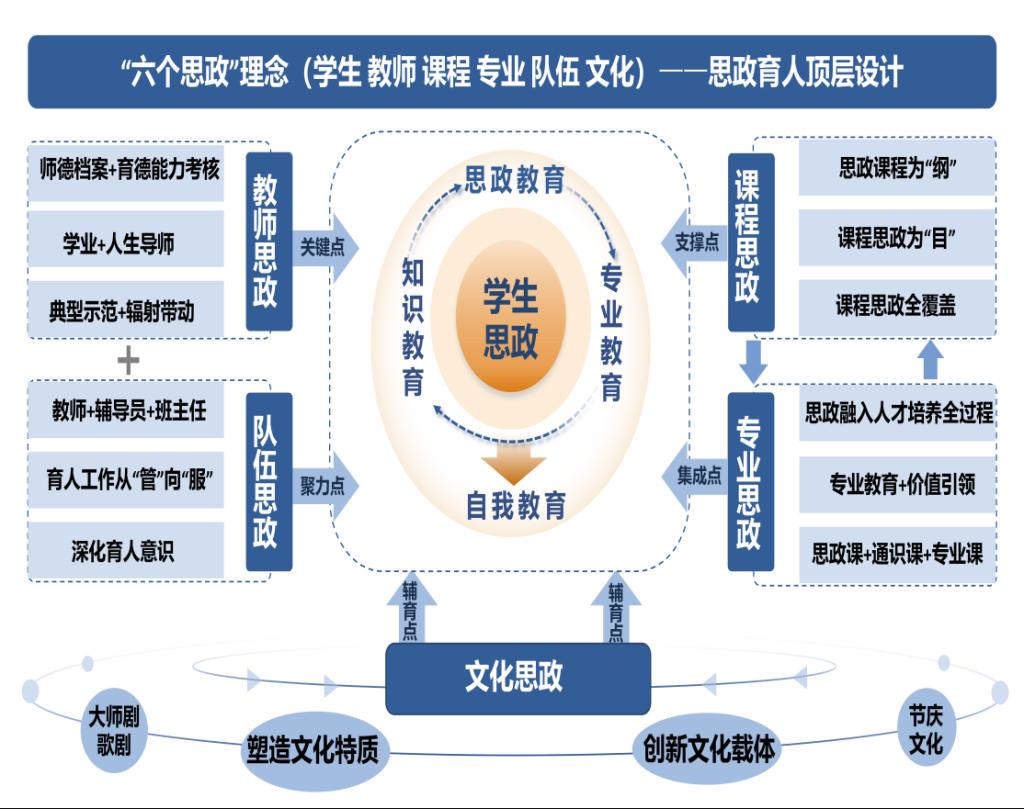 构建“六个思政”一体化思政育人体系,以“学生思政”为核心点,以“教师思政”为关键点,以“课程思政”为支撑点,以“专业思政”为集成点,以“队伍思政”为聚力点,以“文化思政”为辅育点,实现了全主体协同、全领域融合和全场景浸润。《以“六个思政”着力落实协同育人综合改革——青岛大学立德树人路径探索与实践》获2025年学校教学成果奖特等奖、2024年山东省本科教改研究项目重点项目立项。