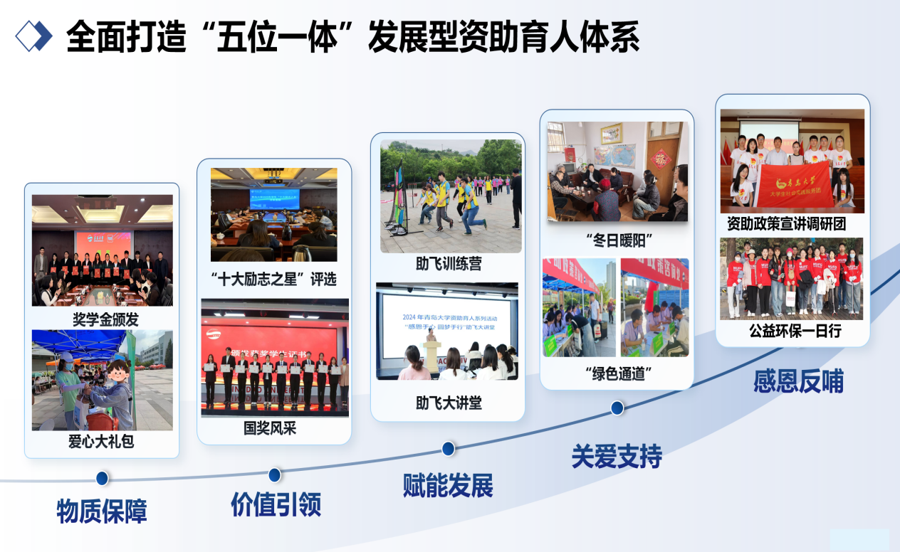 深化“三三五”资助育人体系,坚持以生为本、精准资助、全面发展三大理念,强化制度保障、队伍建设、平台支撑三大要素,打造“物质保障-价值引领-赋能发展-关爱支持-感恩反哺”五位一体的发展型资助育人体系,切实提升学生资助水平。五年来,先后为1.74万余人次学生办理国家助学贷款;累计发放各类资助资金,资助学生24.2万余人次。打造“国奖风采”、“励志之星”等品牌活动,开设“助飞大讲堂”等资助育人系列活动30余场,全面推动资助工作从“保障型”向“赋能型”转变,助力每一位家庭经济困难学生成长成才。工作案例获评山东省学生资助工作优秀案例一等奖。