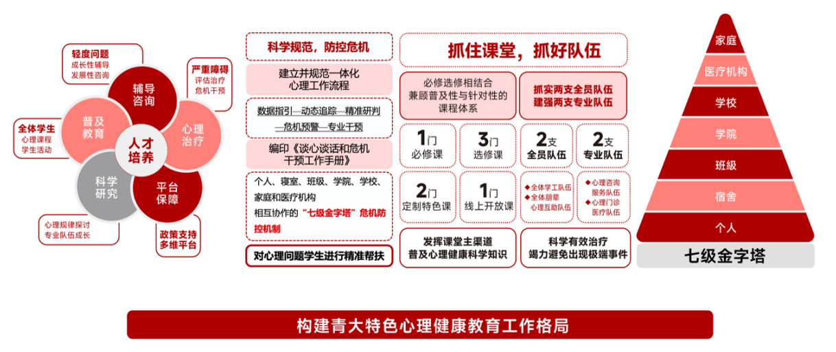 以积极心理学为导向,构建“预防-干预-发展”三位一体心理育人体系,完善“七级金字塔”危机预警和干预机制,成立生命教育研究中心、青大杰正大学生心理干预研究所。精确排查,一年两次全覆盖心理筛查,春季学期覆盖全体学生,秋季学期覆盖全体新生,形成重点群体数据库,“一生一策”精准指导。完善危机响应机制,强化“四协同”:家校协同、咨诊协同、医校协同、校警协同,危机干预日常化、精准化、规范化,全力防控危机事件发生。强化心理服务供给,建设省内高校首家校园心理门诊,坐诊时间扩至8个半天。开展千人大型心理团体辅导。建强队伍,配备11名专职心理教师,师生比实现1:4000,每年培育班级心理委员、宿舍心理信息员近6000人,获评“全国大学生心理健康教育工作先进单位”。