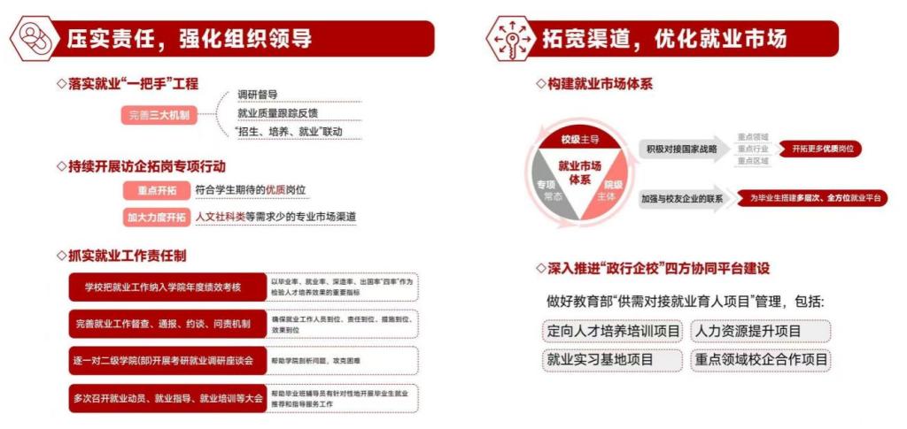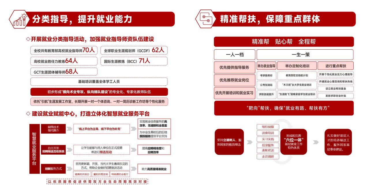 拓宽就业渠道,实施就业“一把手”工程,校院两级领导带头开展访企拓岗专项行动,累计走访企业超1200家,新拓就业岗位1万余个;共建校地就业工作站50个、就业实习“双百基地”134个,立项教育部供需对接就业育人项目79个;每年举办线上线下招聘活动500余场,提供岗位超7万个,毕业生与有效岗位比达1:7。“十四五”期间,我校本科生继续深造率实现连续9年正增长,最高达41.93%,深造质量列省属高校第一。强化分类指导,推广“就业地图”智能系统,相关课程获评全国高校就业创业金课,省级一流本科课程,获评首届《大学生职业发展与就业指导》课程教学赛道全国总决赛银奖,获第二届全国大学生职业规划大赛国赛金奖1项银奖1项;开展就业赋能沙龙35期、就业指导专题活动二百余期。学校就业工作获教育部点名表扬,相关案例入选教育部百大就业创业经典案例。