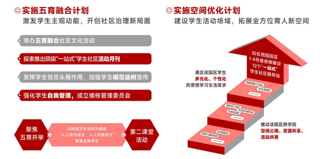 多维融合推进“一站式”学生社区建设,出台《“一站式”建设实施方案》,实施党建领航、队伍聚力、空间优化、五育融合四大计划,整合场域资源,丰富场景体验,建成6个服务站,把精准思政做到“家”。“一站式”学生服务大厅自开放以来,日均服务学生300余人次,举办党建引领、学业帮扶、就业指导活动累计近千余场,实现“党建阵地全覆盖、服务师生零距离”。优化布局,拓展育人空间,五年来学校高标准大修改造26座学生公寓。数字赋能,全面启动“智慧学工”,信息化平台迭代升级,开通35个模块,上线39项功能,整合校内学生各项信息,实现数据的唯一性、准确性、完整性和系统性,推动学生管理服务网络化、数据化、精细化。构建体系化、差异化、精准化学生安全教育管理工作机制,平稳处置突发应急事件,守护学校改革发展安全底线。
